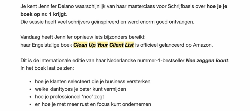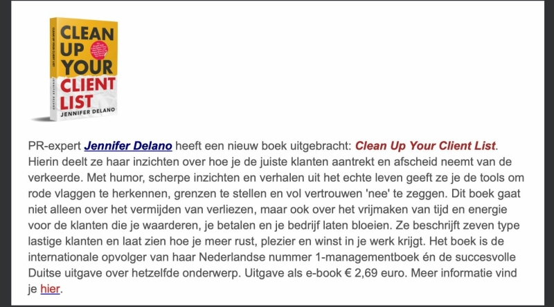 Ben je nieuwsgierig geworden naar het boek? Ga dan vooral even naar Amazon, bestel Clean Up Your Client List, blader er goed doorheen (zodat Amazon merkt dat je het gelezen hebt 😉) en laat een review achter als je wilt.