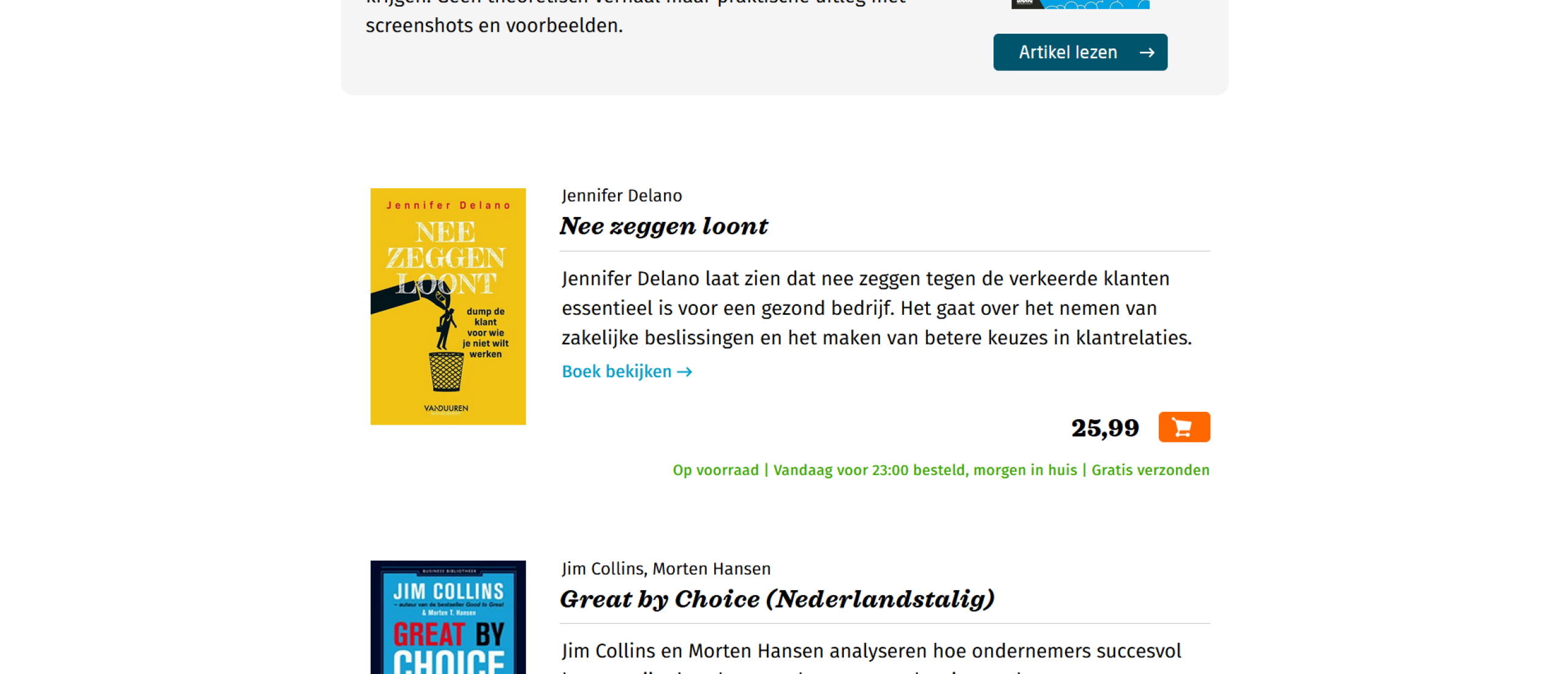 Managementboek maakte een zorgvuldig samengestelde lijst met boeken die elke ondernemer zou moeten lezen. En eerlijk: de selectie is fantastisch. Dat Nee zeggen loont daar tussen staat, voelt als een grote eer.